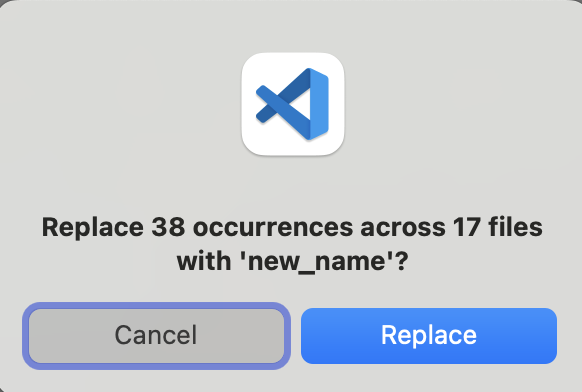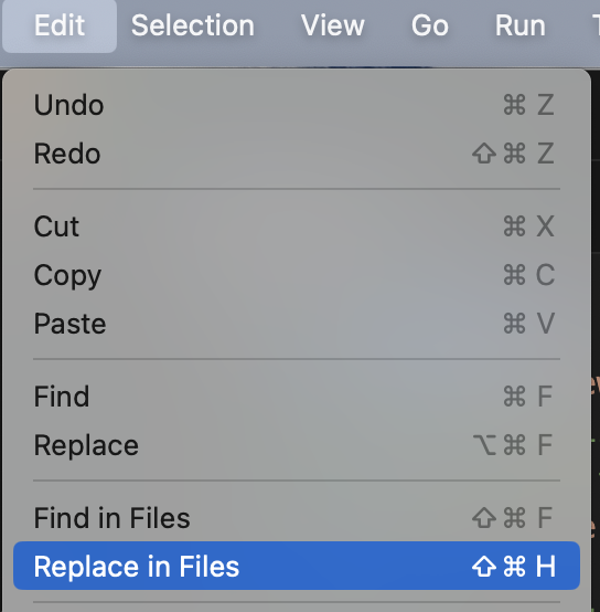2. Vs Code Menu: Edit > Replace in Files (Shift + Ctrl + H)