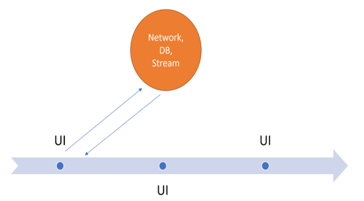 The diagram shows how the main execution line, which deals with the user interface, can call a long-running task asynchronously without stopping to wait for results, and when the long-running task completes, it returns to the main execution line, which can handle it.