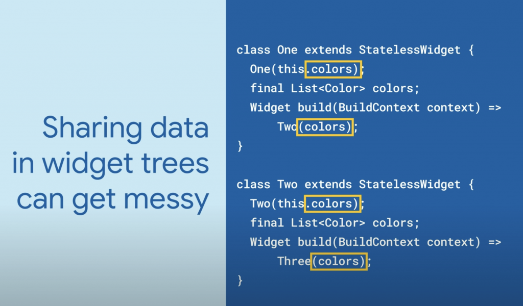 InheritedWidget (Flutter Widget of the Week) –> https://www.youtube.com/watch?v=1t-8rBCGBYw
