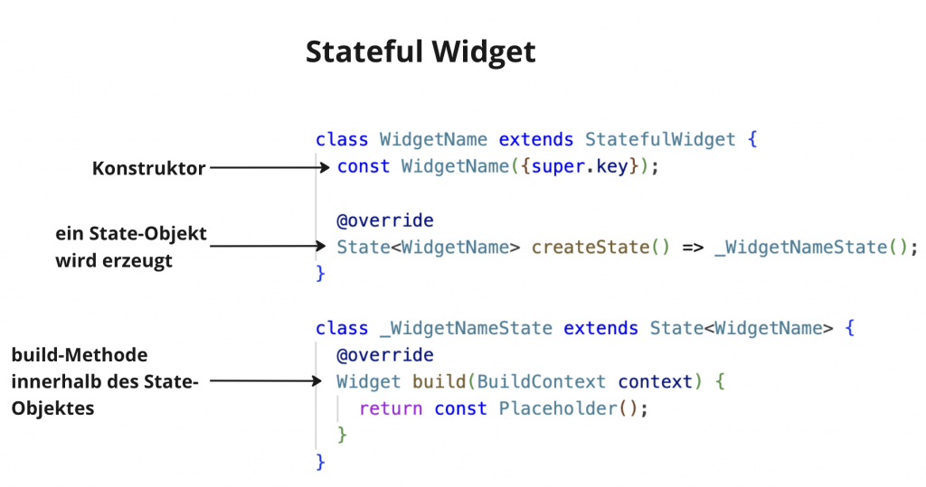 Im body eines Stateful Widgets hat es einen Konstruktor und erzeugt einen State-Objekt.