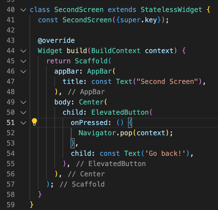 Ein weiteres Beispiel für Verwendung des Navigator-Widgets ist hier: https://www.geeksforgeeks.org/routes-and-navigator-in-flutter/?ref=rp