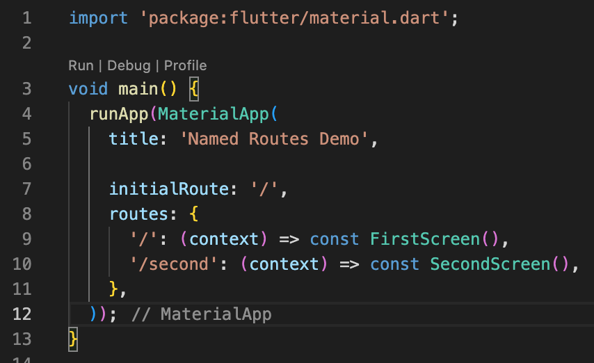 2. Die Eigenschaft home des Widgets MaterialApp mit der Eigenschaft initialRoute (mit dem Wert ‚/‘) ersetzen . Darunter eine weitere Eigenschaft route mit Wert verwenden: